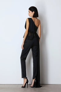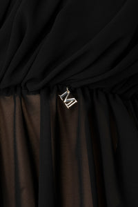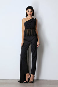 Top asimmetrico monospalla realizzato in chiffon presenta un lungo strascico laterale Dettaglio applicazione sulla spalla e sulla vita.