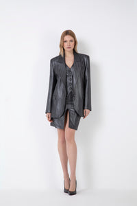 Blazer in Lurex dal taglio sartoriale e spallina importante. Il design a monopetto modella elegantemente la figura e si stringe in vita. Super classy but chic indossato con il panciotto e la gonna tubino coordinati.